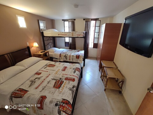 1 cama doble y 1 cama individual o 1 cama doble y un camarote (litera), tv, agua caliente en la ducha, Wi Fi, desayuno continental, máximo 4 personas por habitación.
